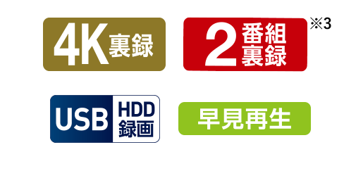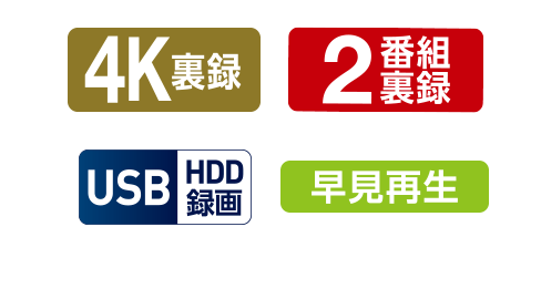 55V/50V/43V4Kチューナー2基搭載だからUSBハードディスクで4K放送も裏番組録画できる。